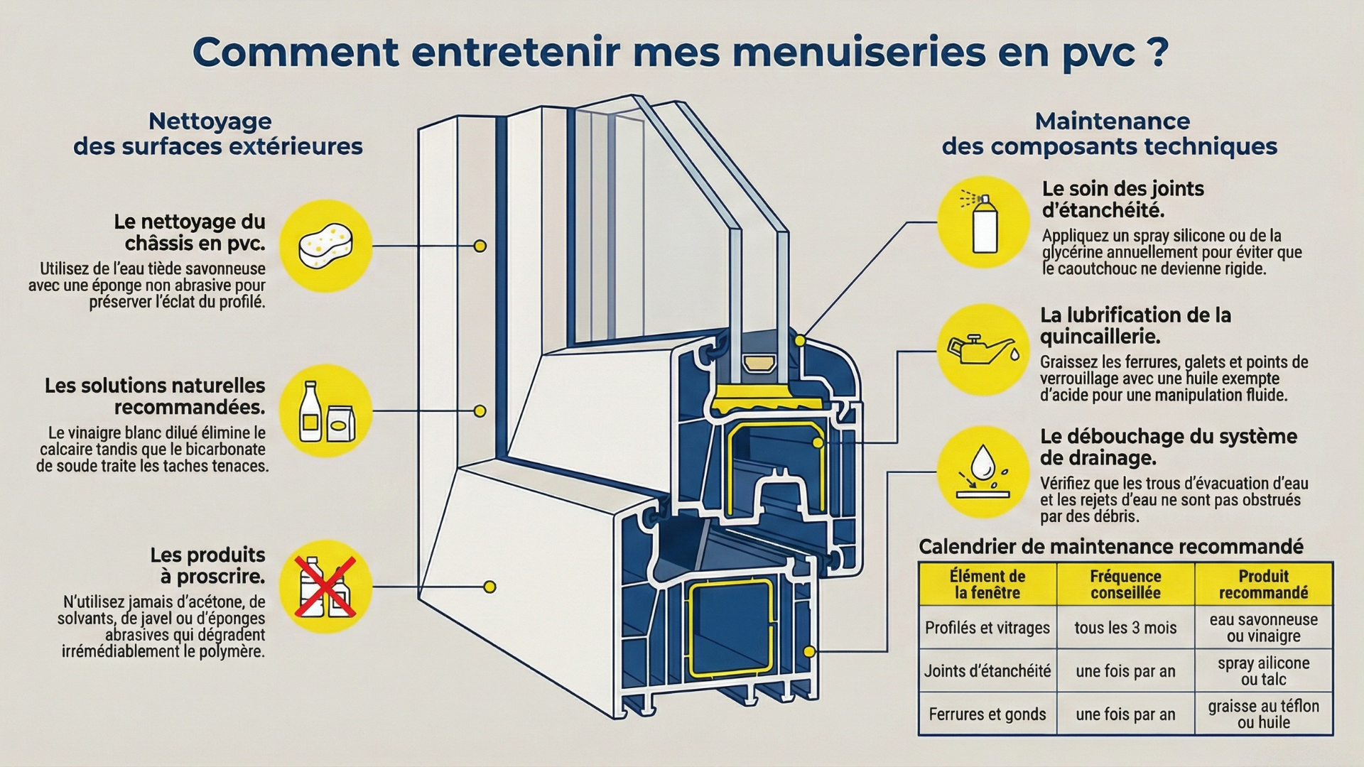 | Type de menuiserie | Nettoyage complet | Rinçage à l'eau claire | Lubrification | Vérification des joints |
