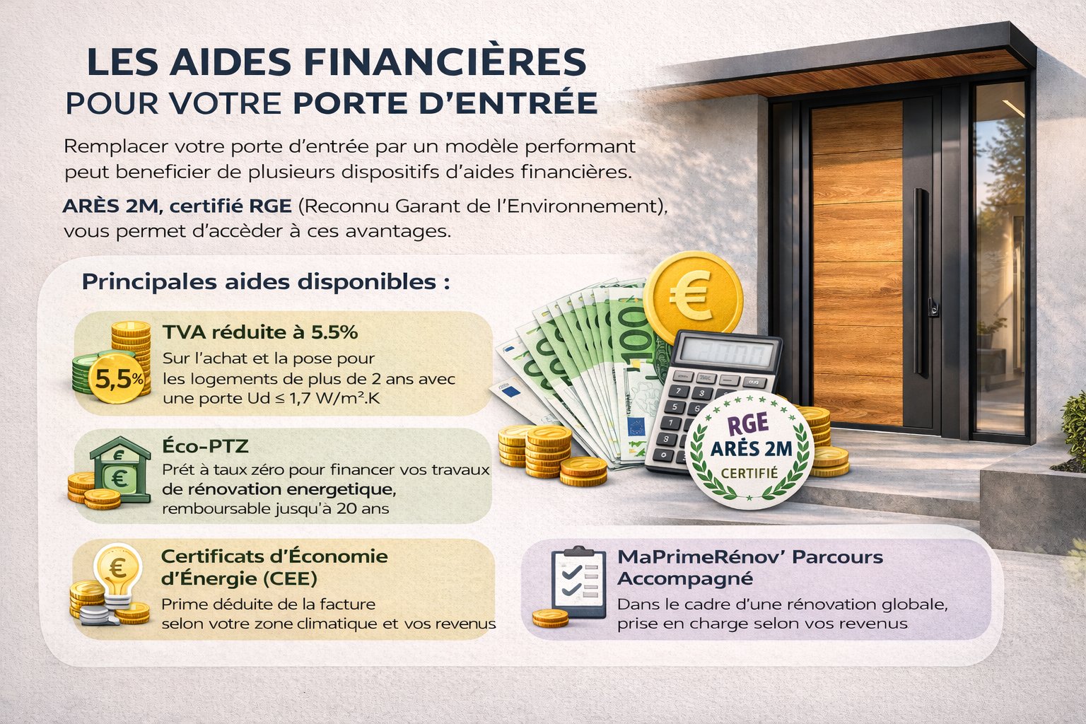 Le remplacement de votre porte d’entrée par un modèle performant peut bénéficier de plusieurs dispositifs d’aides financières en 2026. ARÈS 2M, certifié RGE (Reconnu Garant de l’Environnement), vous permet d’accéder à ces avantages.