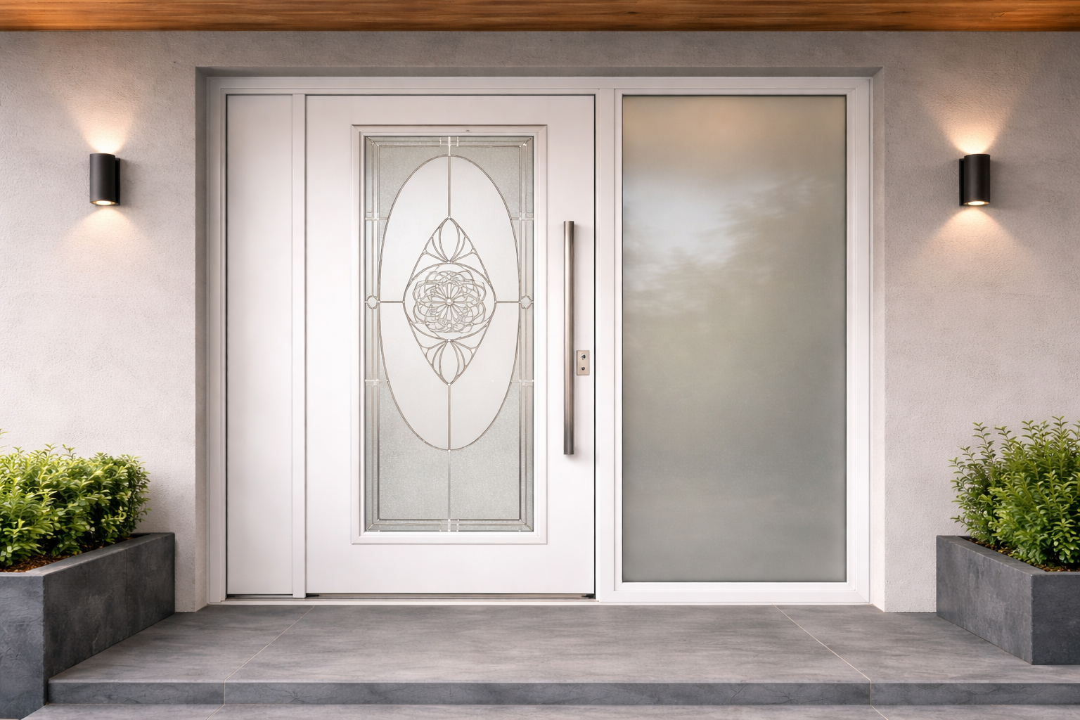 Nos portes d’entrée vitrées intègrent du double vitrage feuilleté retardateur d’effraction (classe P4A à P5A). Ce vitrage résiste aux chocs et retarde considérablement les tentatives d’intrusion, tout en apportant de la luminosité à votre entrée.